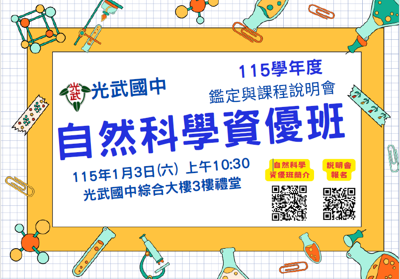 三、有關光武國中115學年度資優新生報名與自然科學資優班簡介相關事宜,請參閱本校自然科學資優班專頁https://sites.google.com/gwjh.hc.edu.tw/science或本
