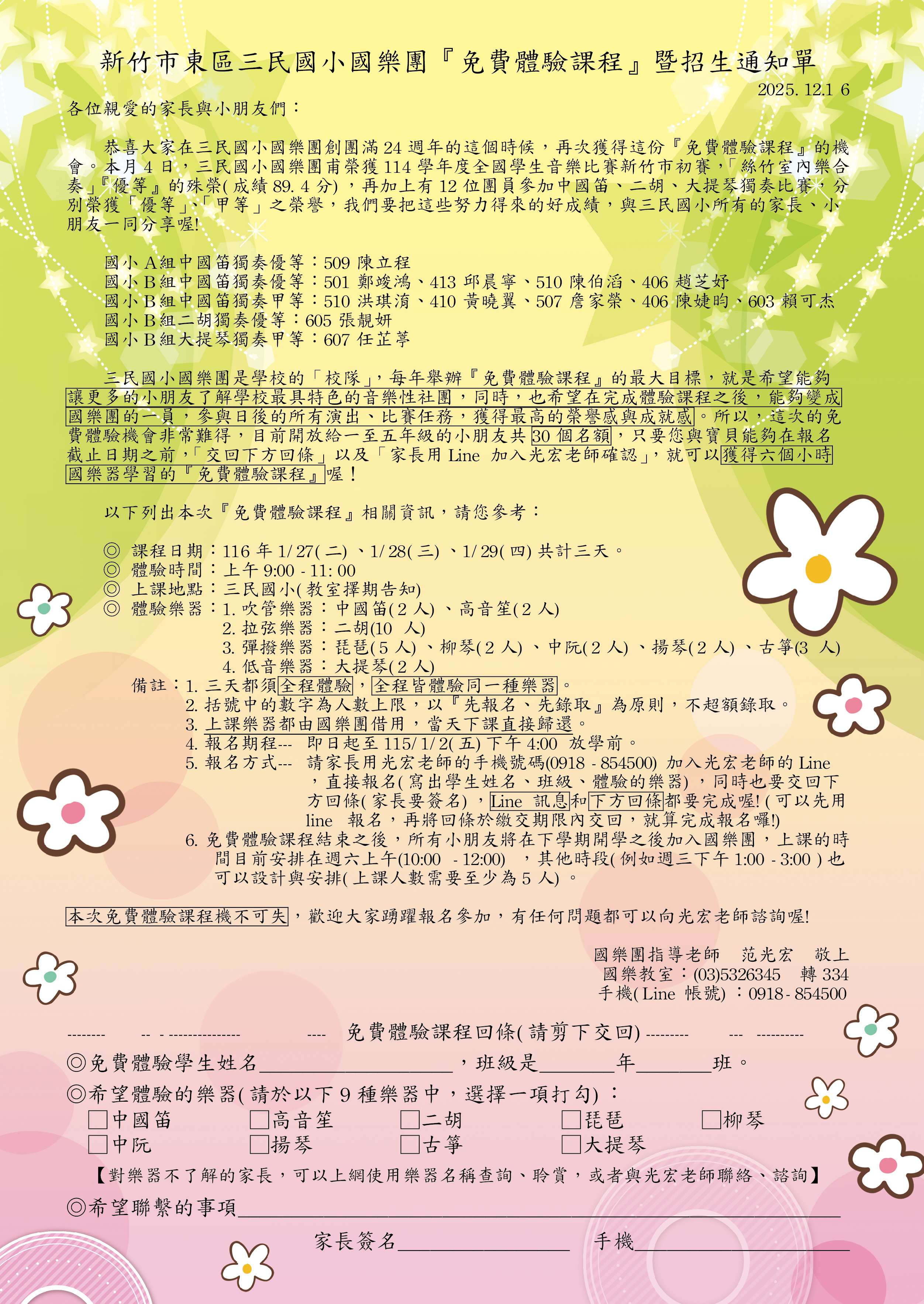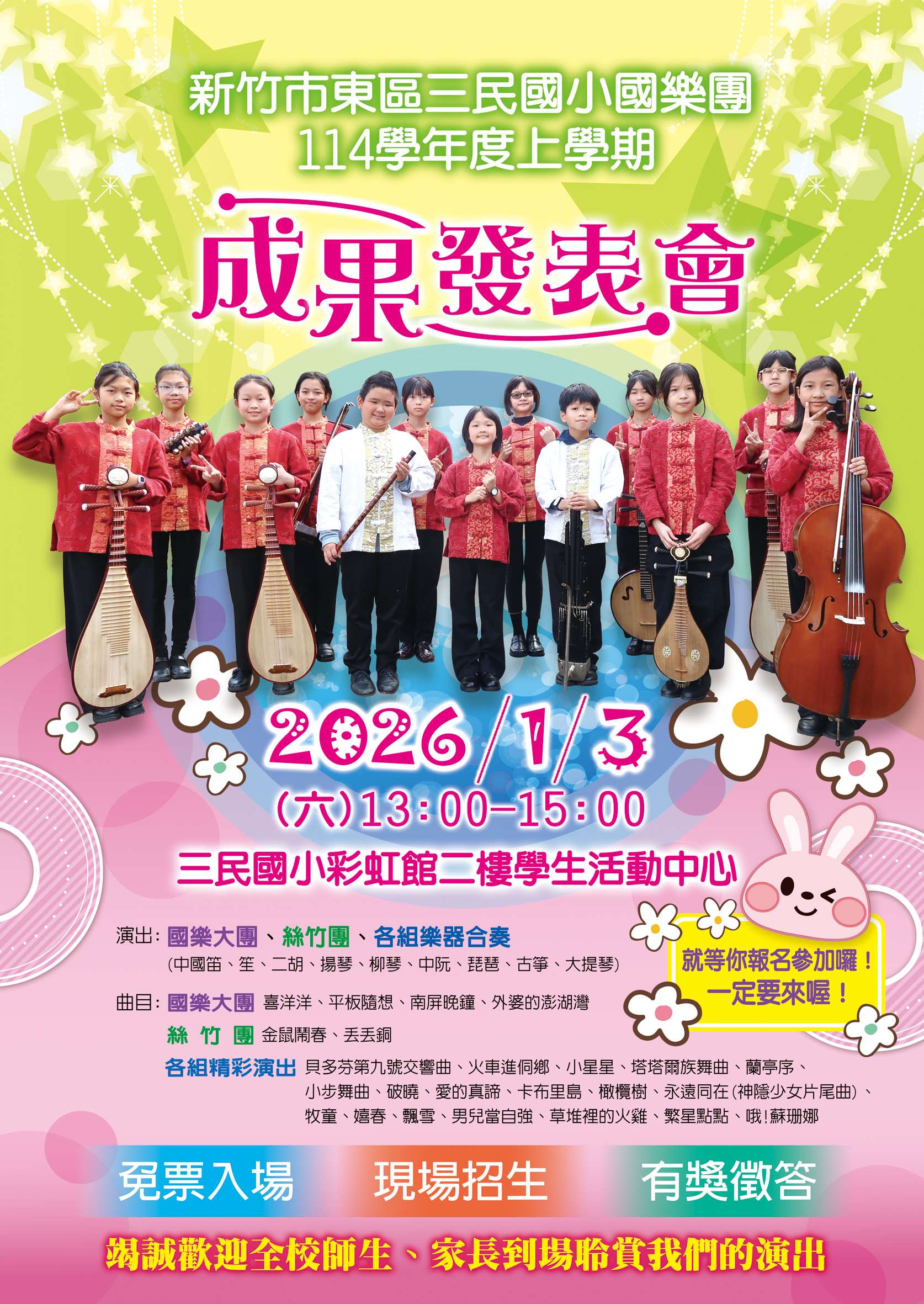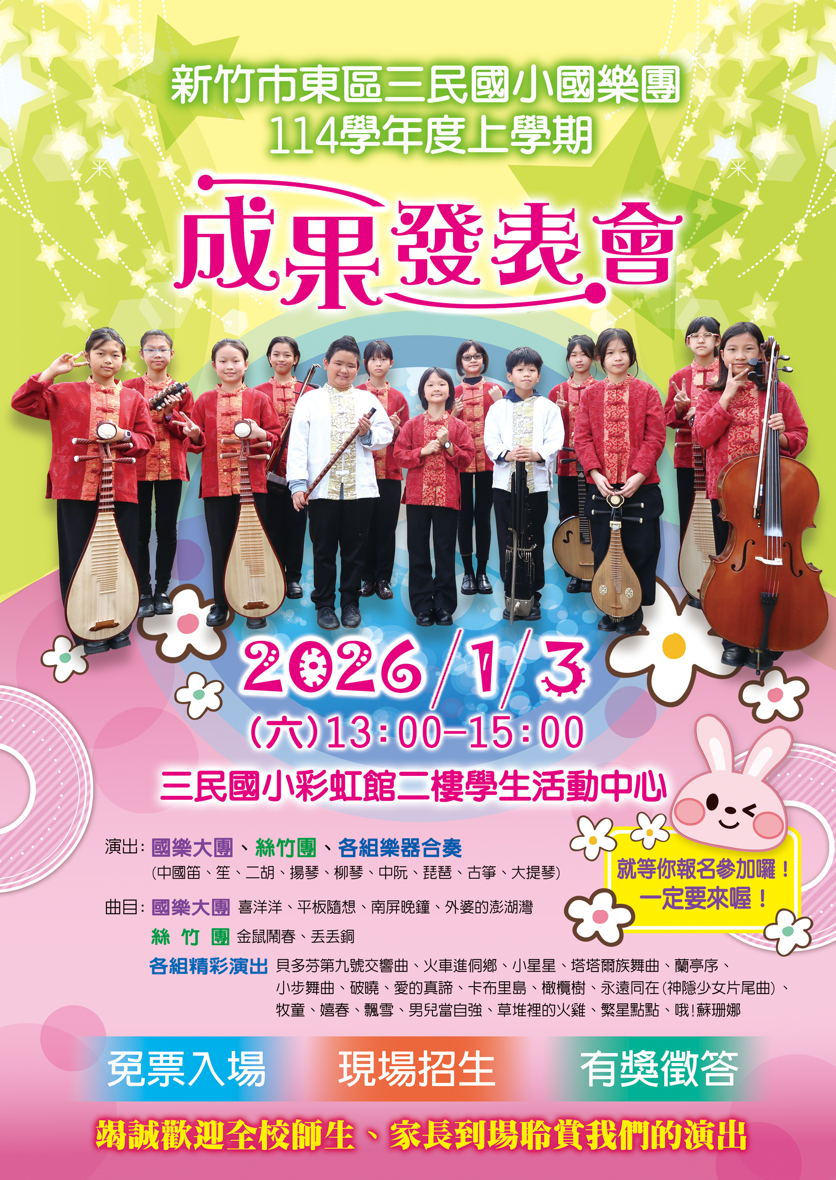 在三民國小國樂團創團滿24週年的這個時候,我們要為大家報告本學期的好戰果。12月4日,三民國小國樂團甫榮獲114學年度全國學生音樂比賽新竹市初賽,「絲竹室內樂合奏」『優等』的殊榮(成績89.4分),再加上有12位團員參加中國笛、二胡、大提琴獨奏比賽,分別榮獲「優等」、「甲等」之榮譽,我們要把這些努力得來的好成績,與三民國小所有的家長、小朋友一同分享喔!