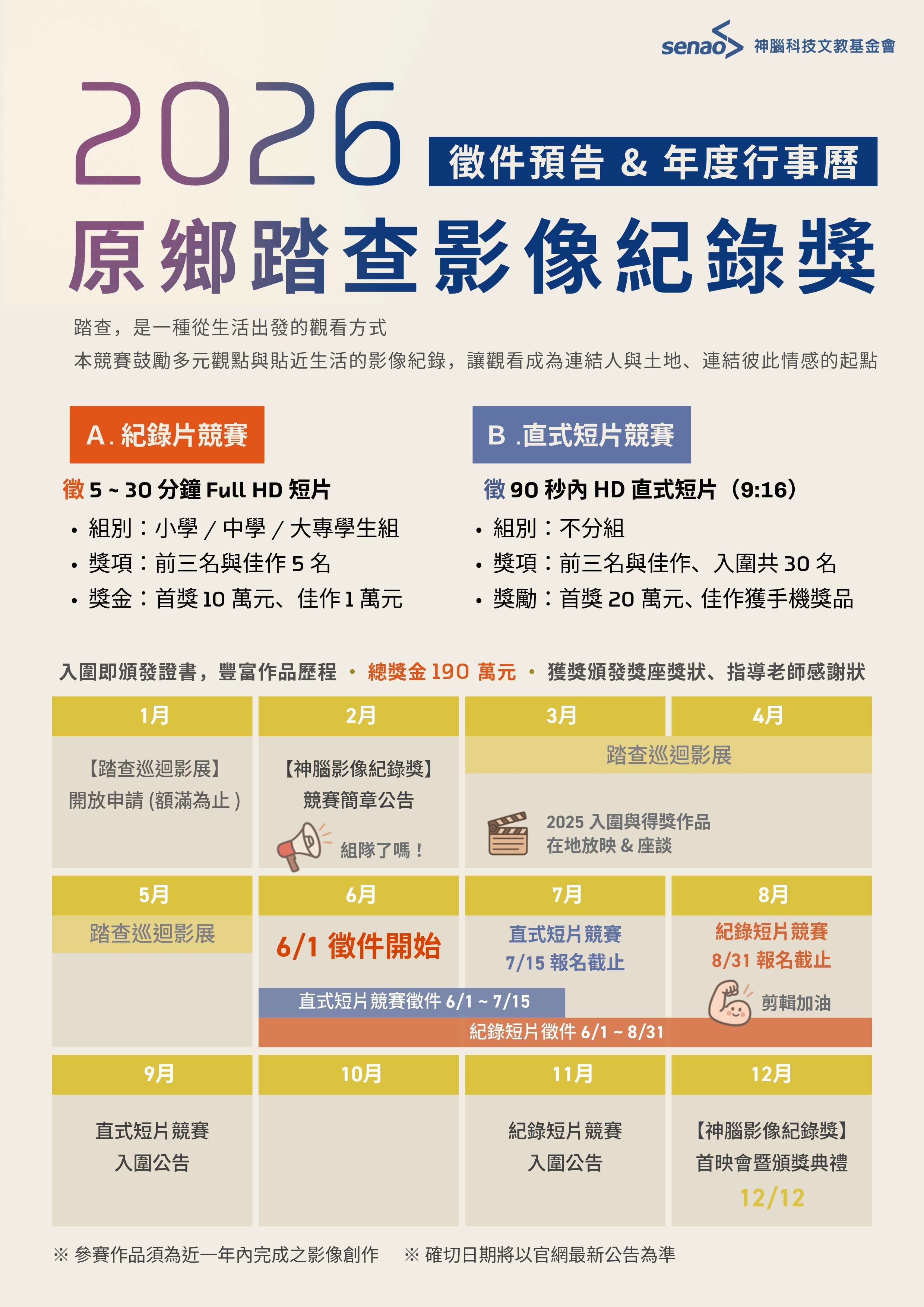 | 五、 | 另本會預計於 115 年 6 月 1 日起辦理「2026 神腦原鄉踏查影像紀錄獎」徵件。本屆徵件包含: |