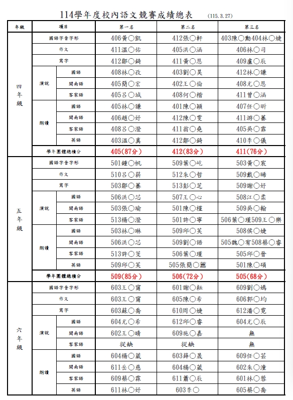 恭喜得獎的同學們,都超棒的!教務處將從四年級和五年級各項目第一二名參賽者,甄選一名同學,於114年9月19日代表三民國小參加新竹市語文競賽複賽。