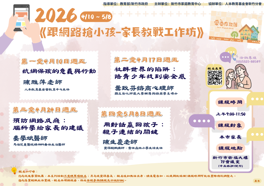 為促進家長理解如何預防孩子網路成癮,家庭教育中心定於4月10日起舉辦「跟網路搶小孩-家長教戰工作坊」系列