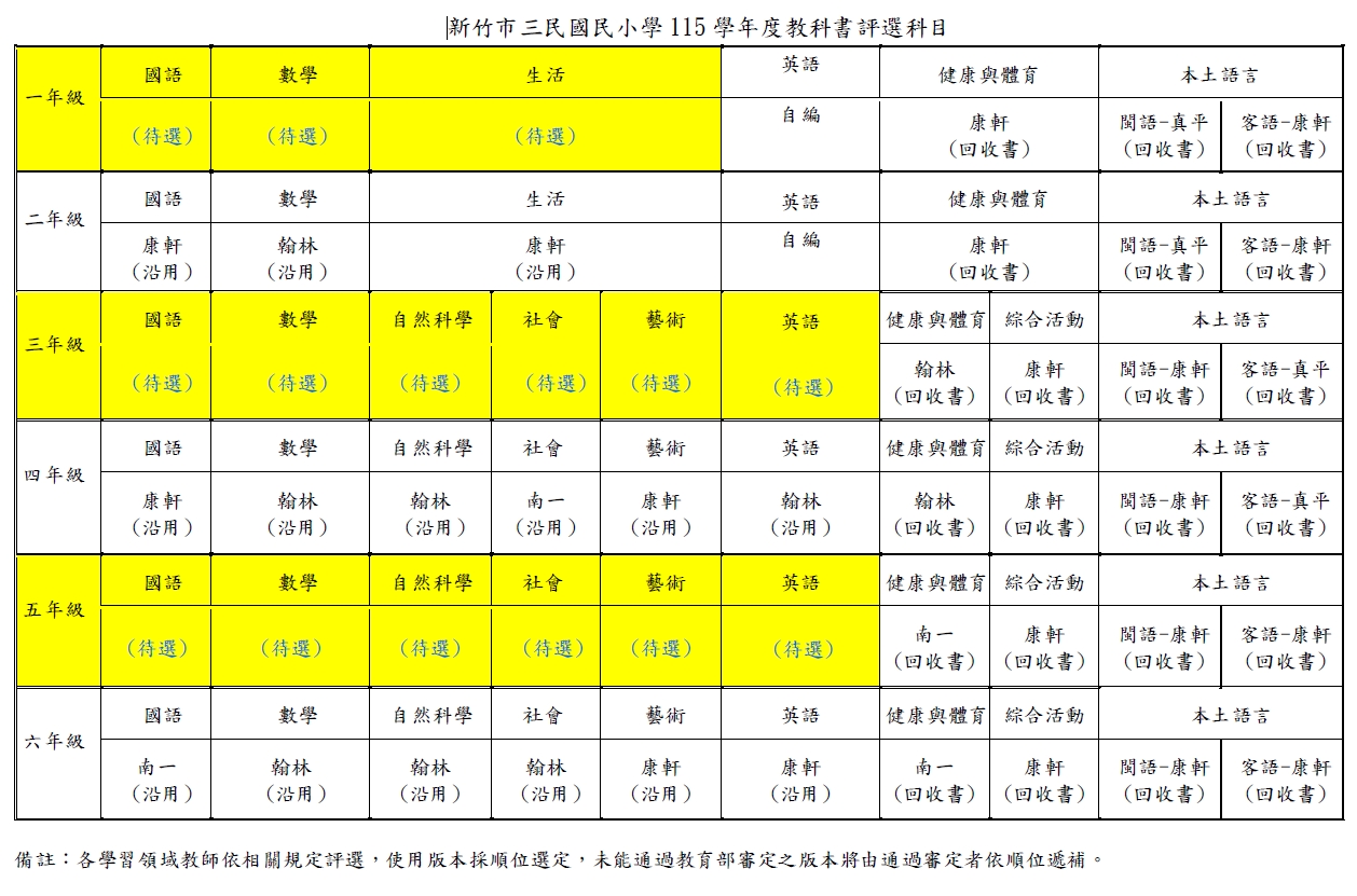 三民國小將於115年4月29日(星期三)辦理新學年度教科書評選。評選年級與科目如下,請欲參加評選之版本將樣書送至教務處。