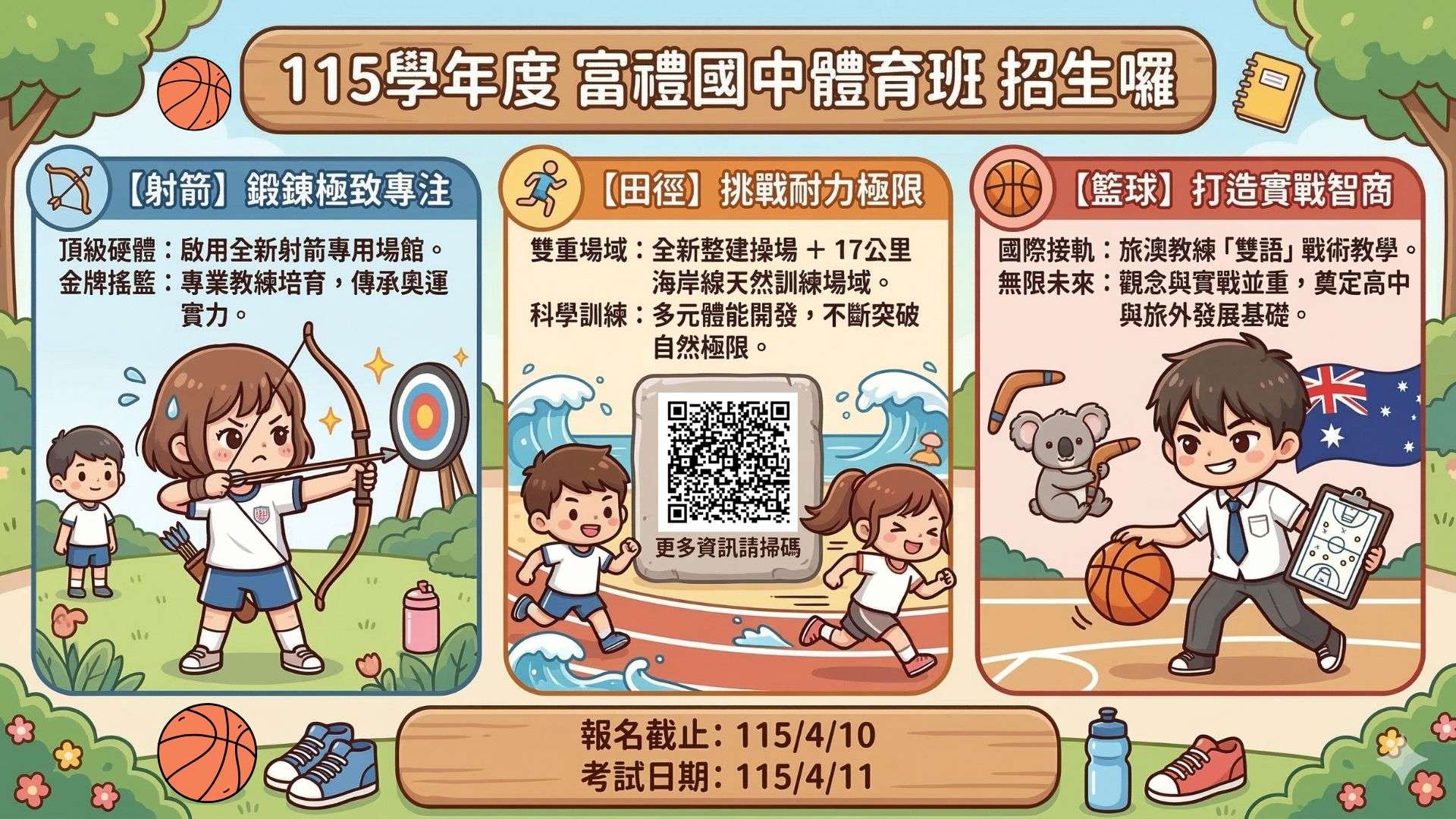 | 一、 | 富禮國中115學年度體育班甄試項目為射箭、田徑、籃球,期能招收本市優秀應屆(畢業)生,敬請廣為宣傳招生資訊,詳細甄選資訊如下: |