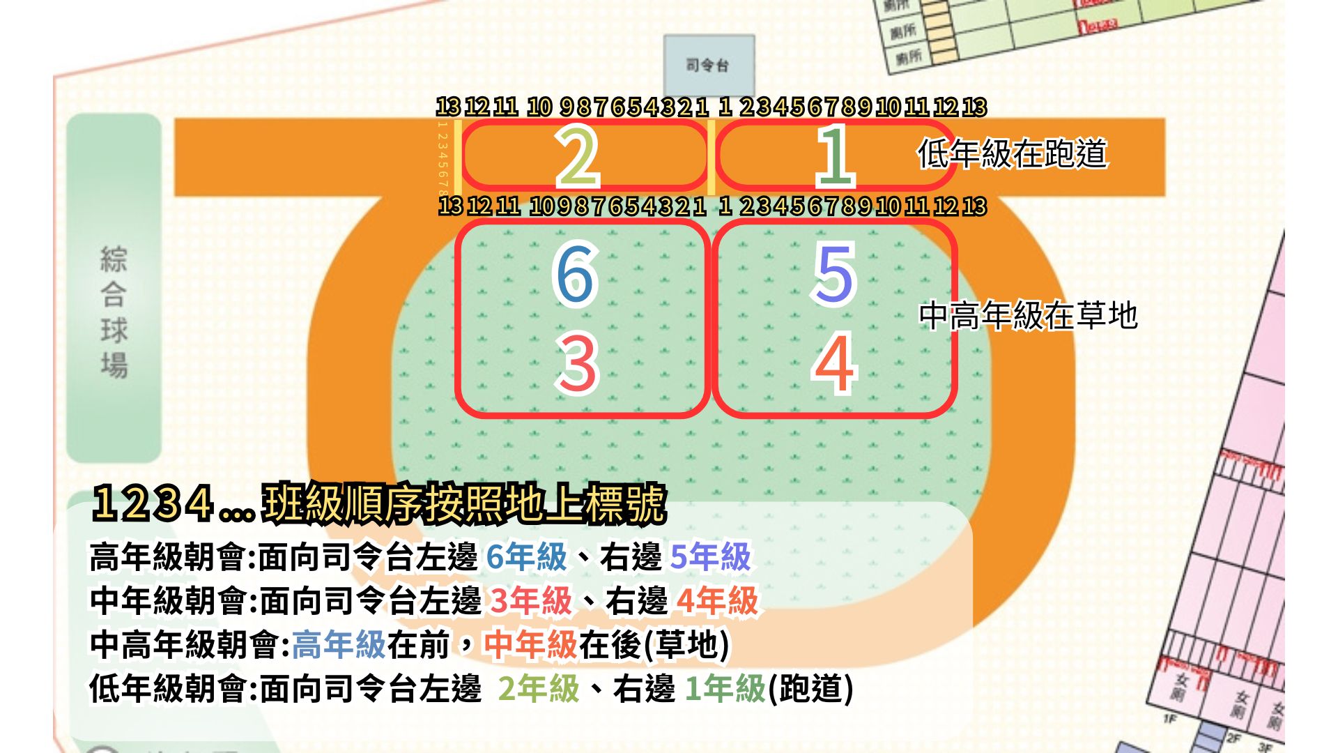 低年級朝會:面向司令台左邊 2年級、右邊 1年級(跑道)
