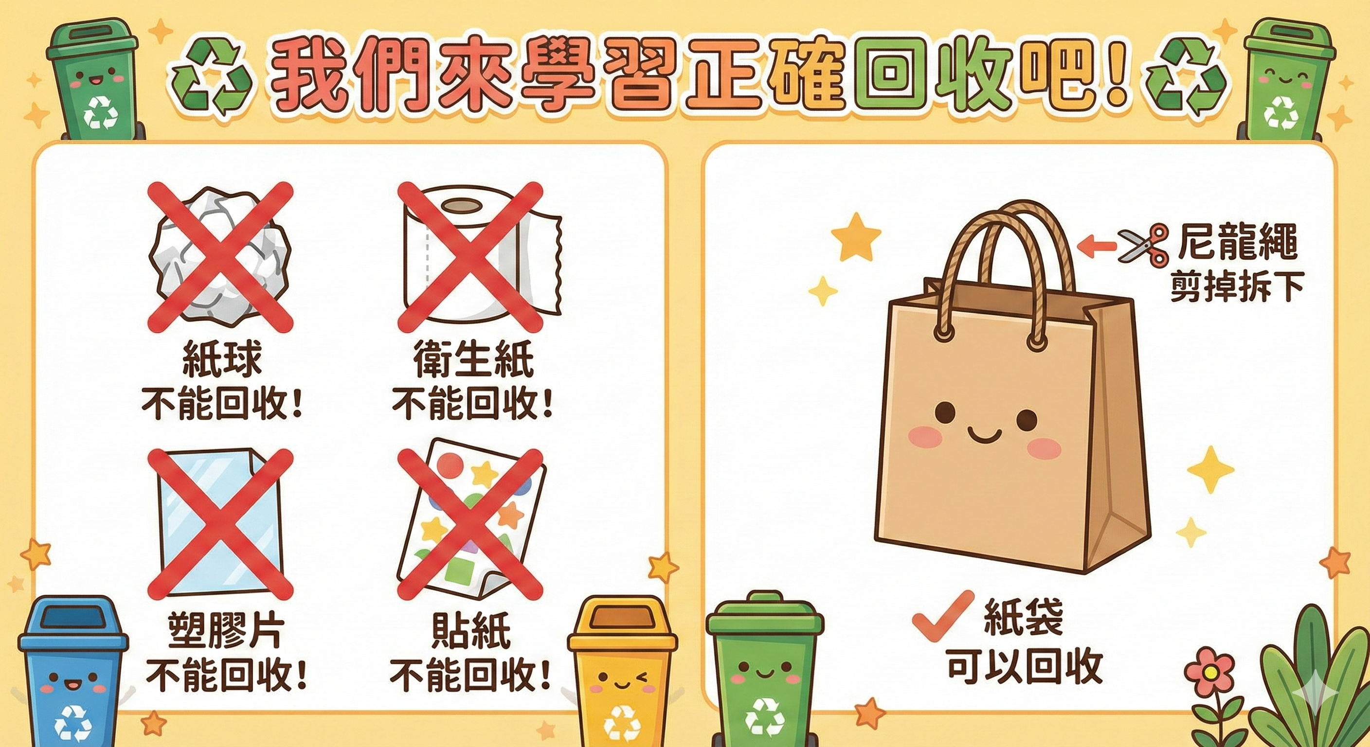 ❌ 不可回收項目:紙球(揉過的紙)、衛生紙、貼紙(含背紙)、塑膠附件皆屬於一般垃圾。