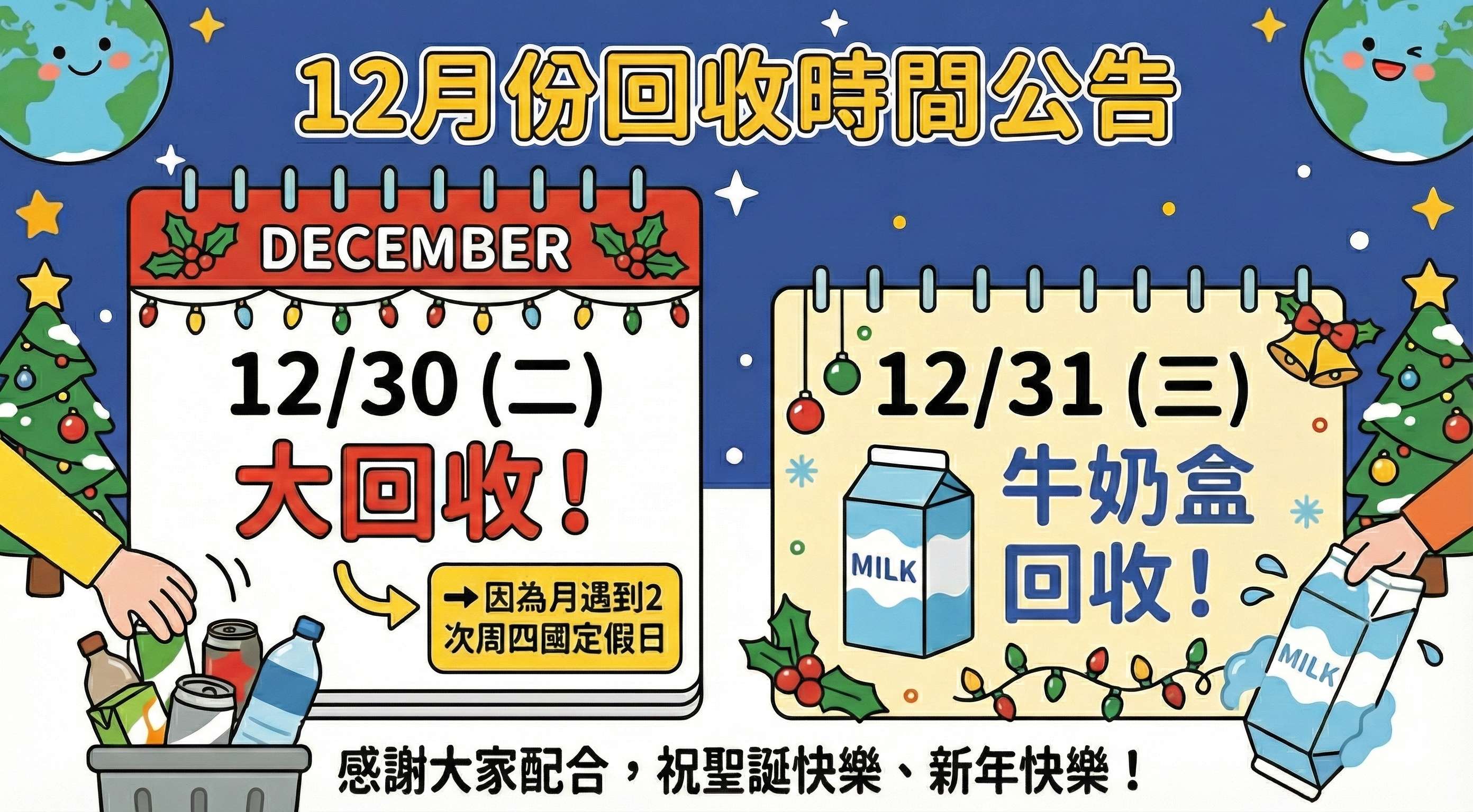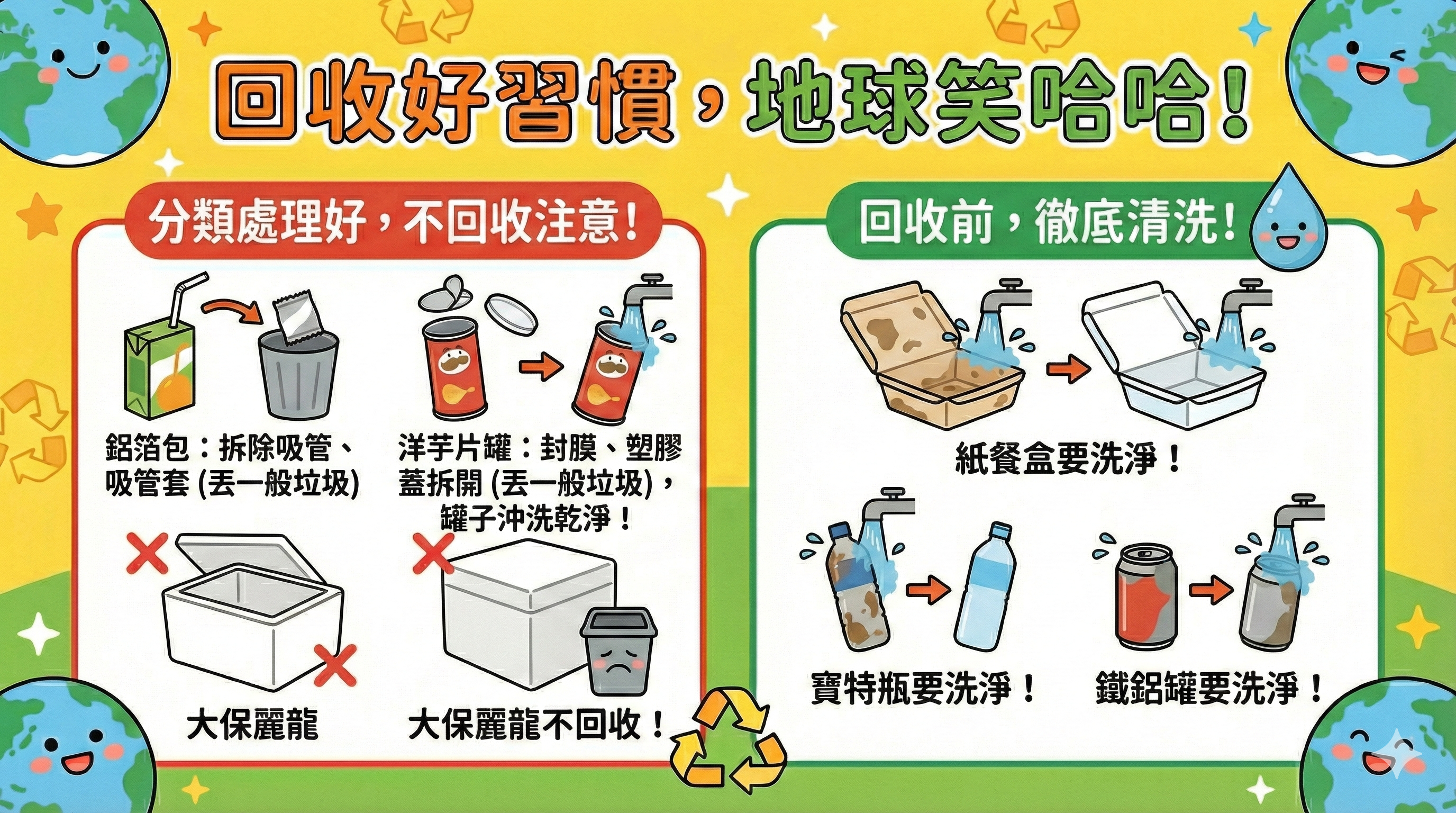 ❌ 不可回收項目:大型保麗龍請勿回收,請放置大型垃圾區。