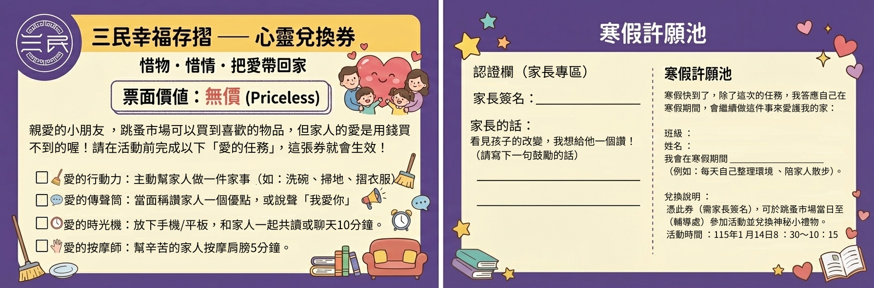 📅 活動時間: 跳蚤市場當日(115年 1 月 14 日)上午8:30-10:15